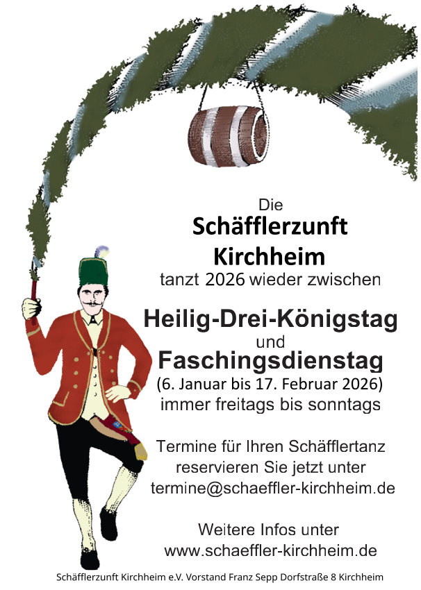 Vom Dreikönigstag am 6. Januar bis Faschingsdienstag ziehen wir durch die Straßen und Plätze von Kirchheim und der Umgebung. In diesen Wochen erfüllt der Klang der Musik die Luft, ein Zeichen dafür, dass die Schäffler wieder unterwegs sind. Mit jedem Auftritt bringen wir Musik, Bewegung und Lebensfreude zu den Menschen, ganz im Sinne der jahrhundertealten Tradition des Schäfflertanzes, die Mut, Hoffnung und Zusammenhalt symbolisiert.